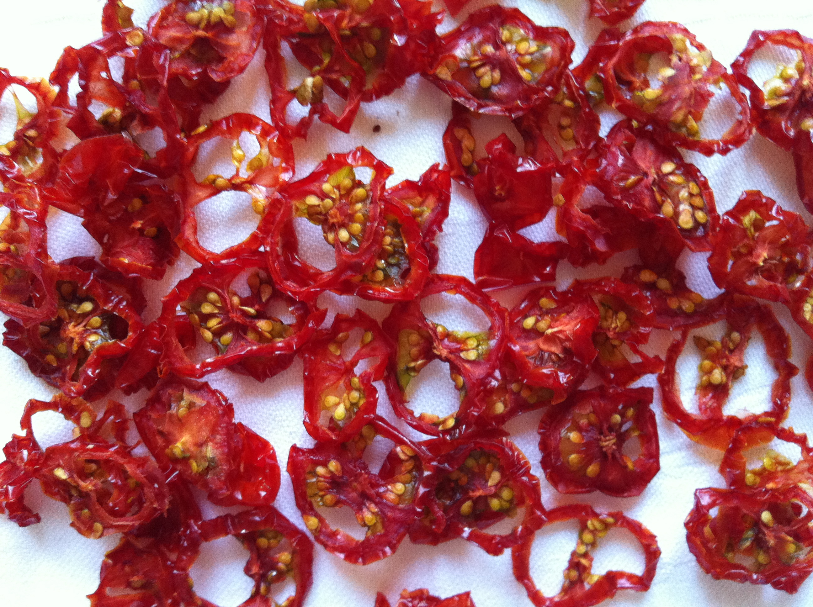 - Strawberries, kiwi and cherry tomatoes: cut into thin slices and dry on a aluminum foil paper. Flip them over every 2-3 hours so that the sugar in them doesn’t stick to the foil. Dry fruit is hard but sticky at the end.